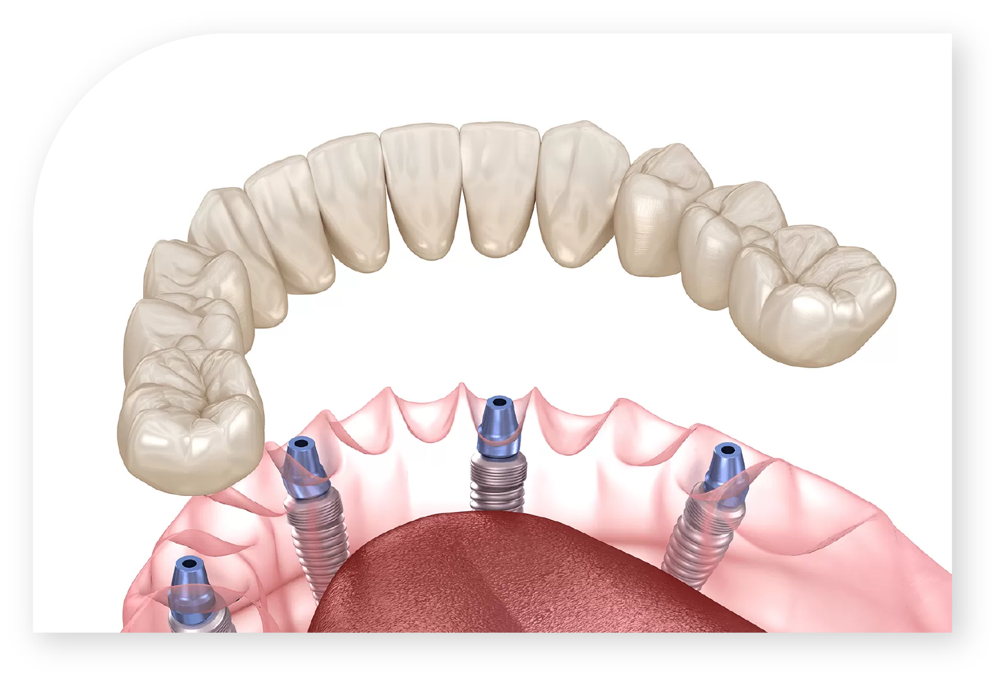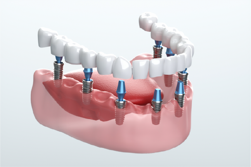 従来は多数のインプラントを埋め込む必要がありましたが、オールオン4は少ない本数で全体を支える構造のため、手術負担を抑えやすい治療法です。